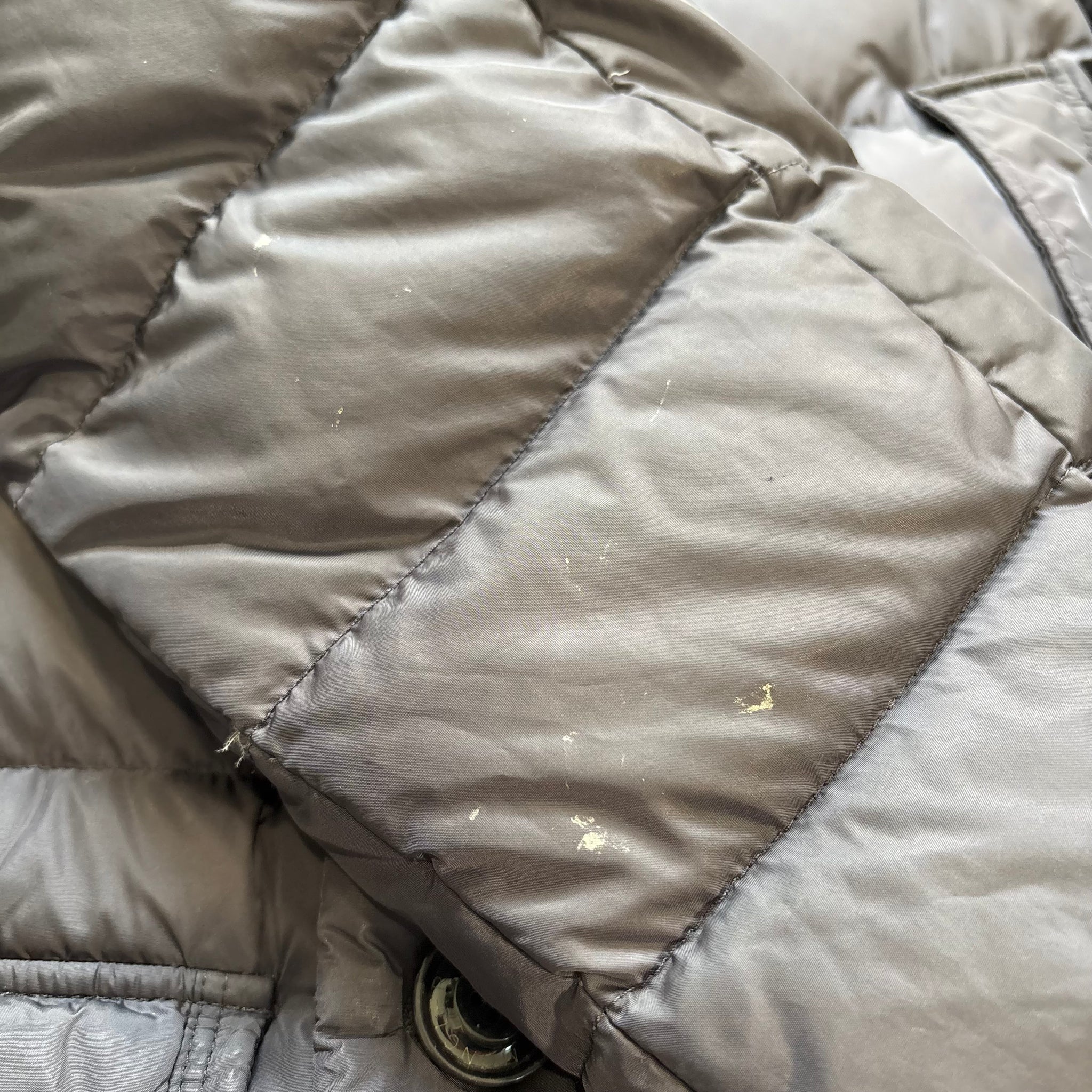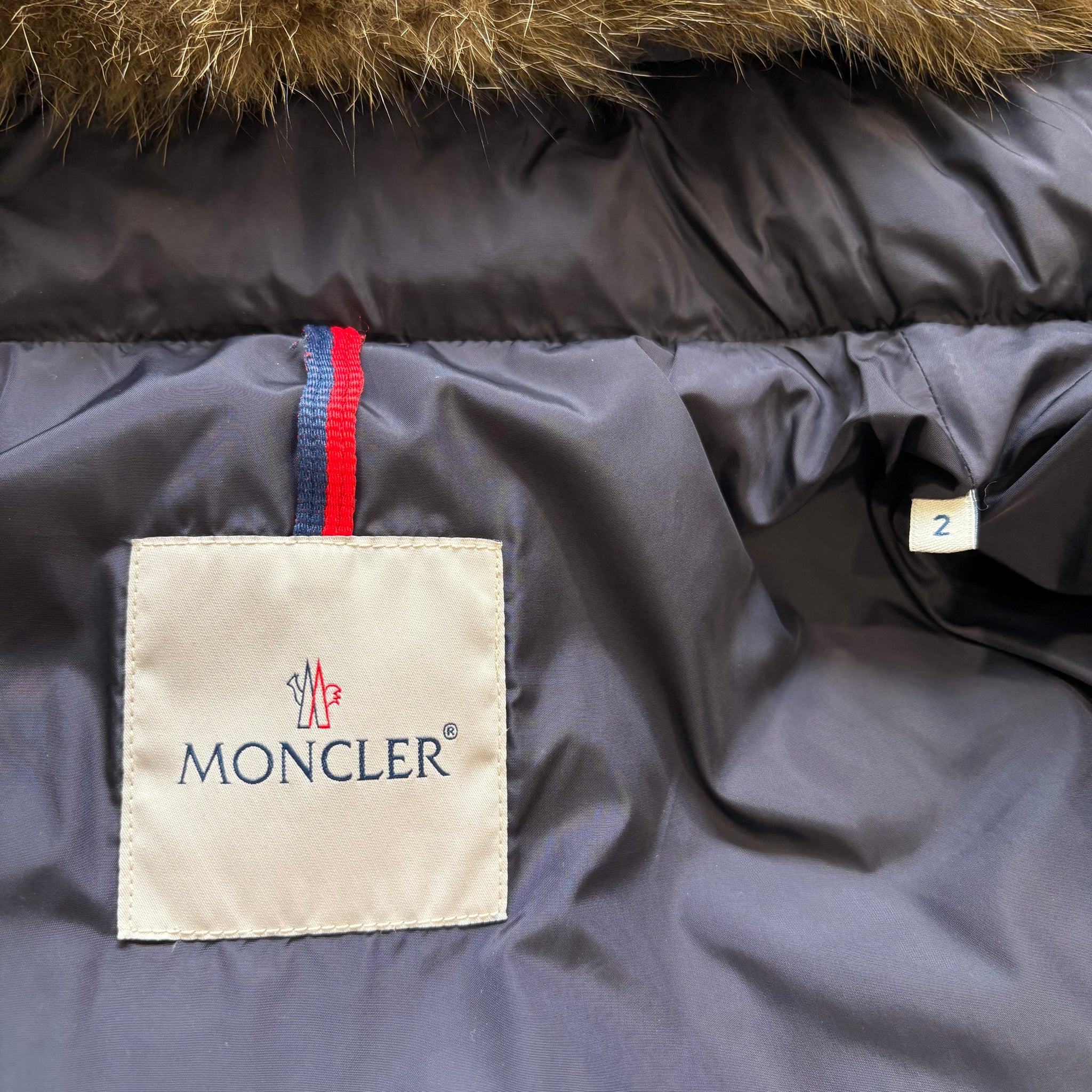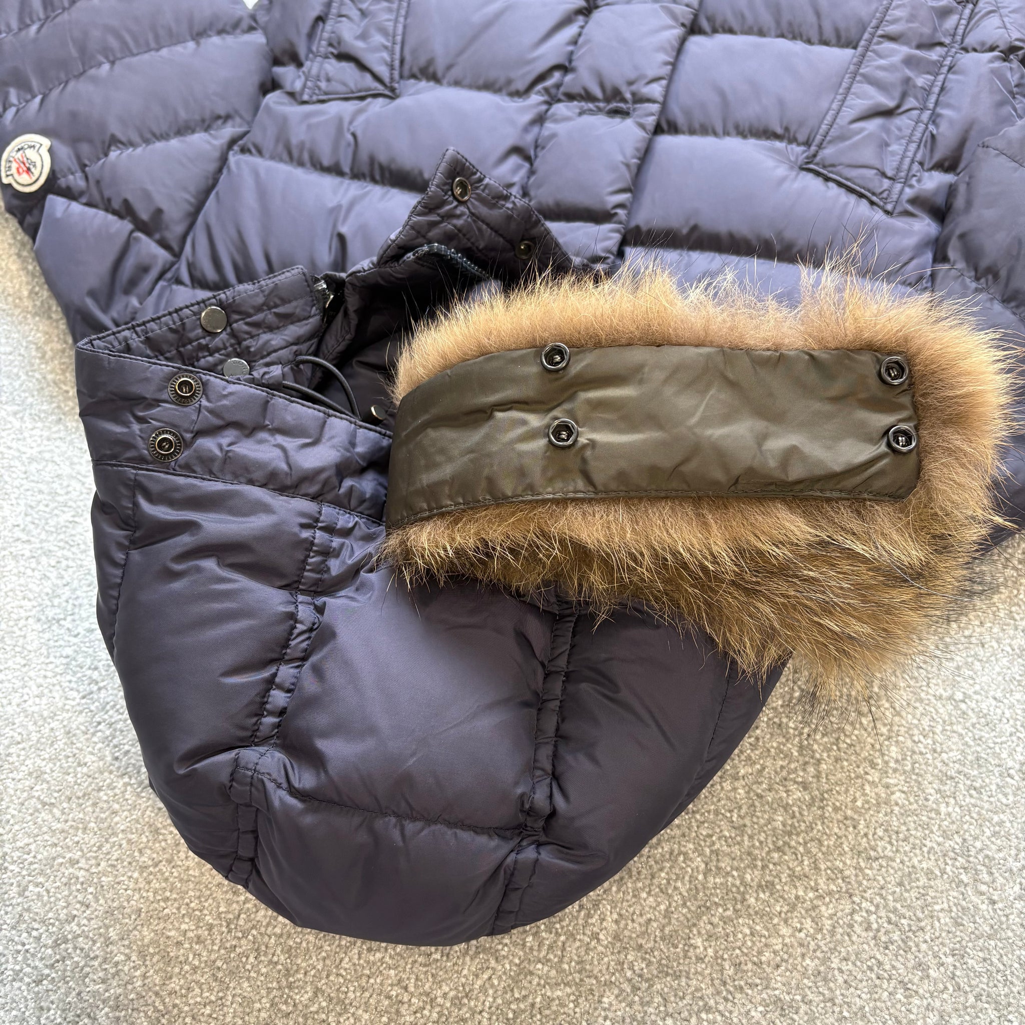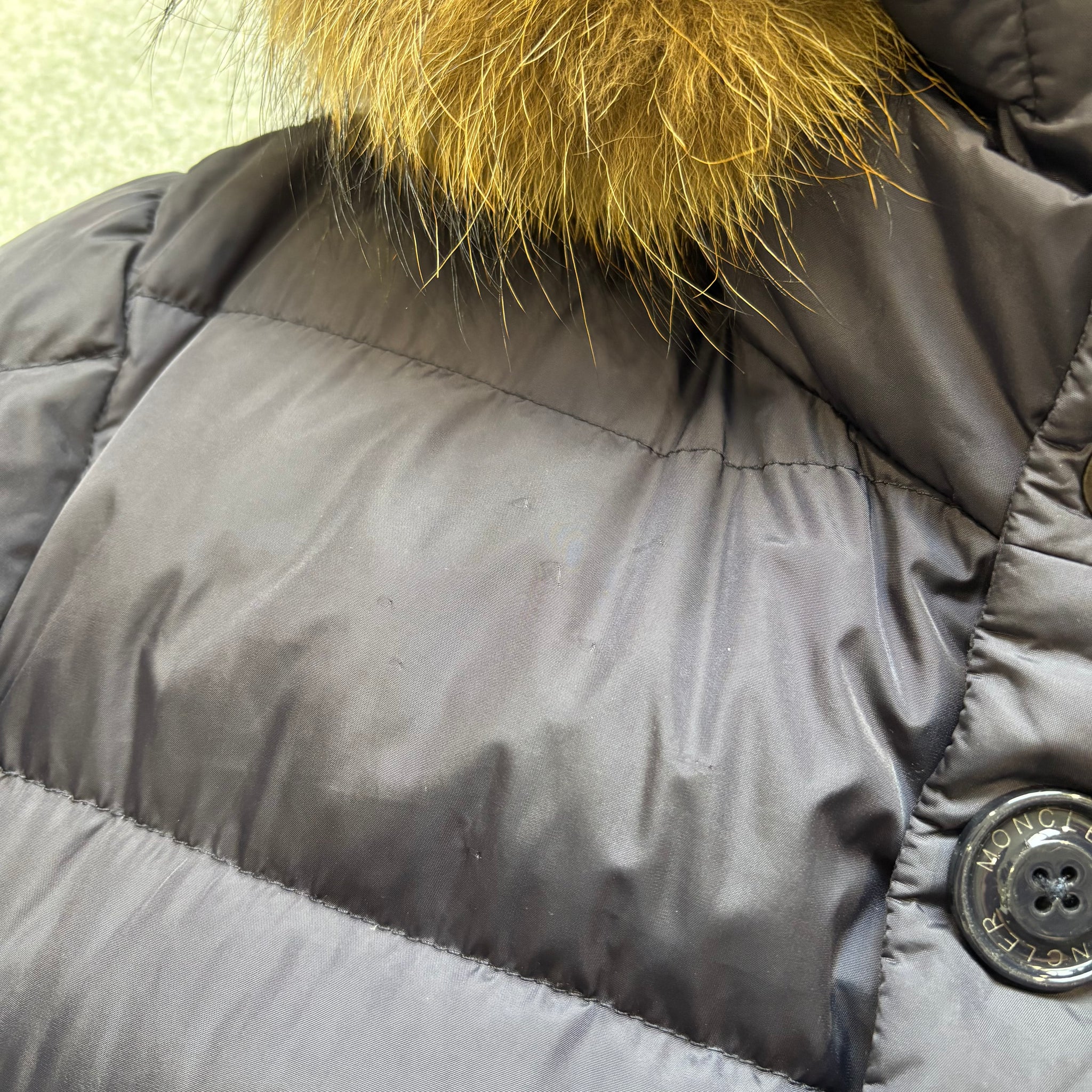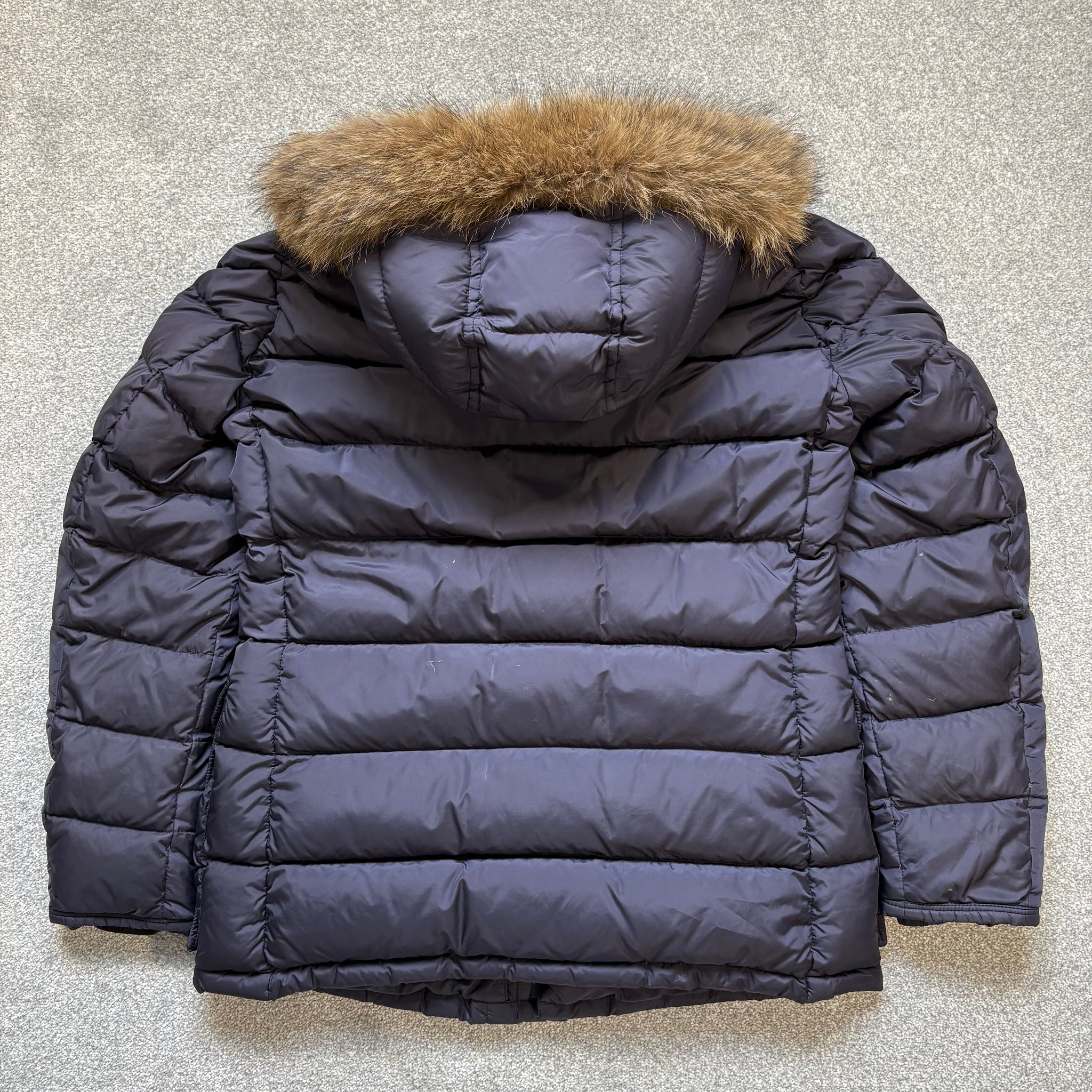 Good condition, has some marks as shown. Slight piece of unstitching inside the cuff. Missing cartoon. Fur originally off a Khaki Cluny, inside lining colour therefore is different, never noticeable when worn. Price reflects this.
