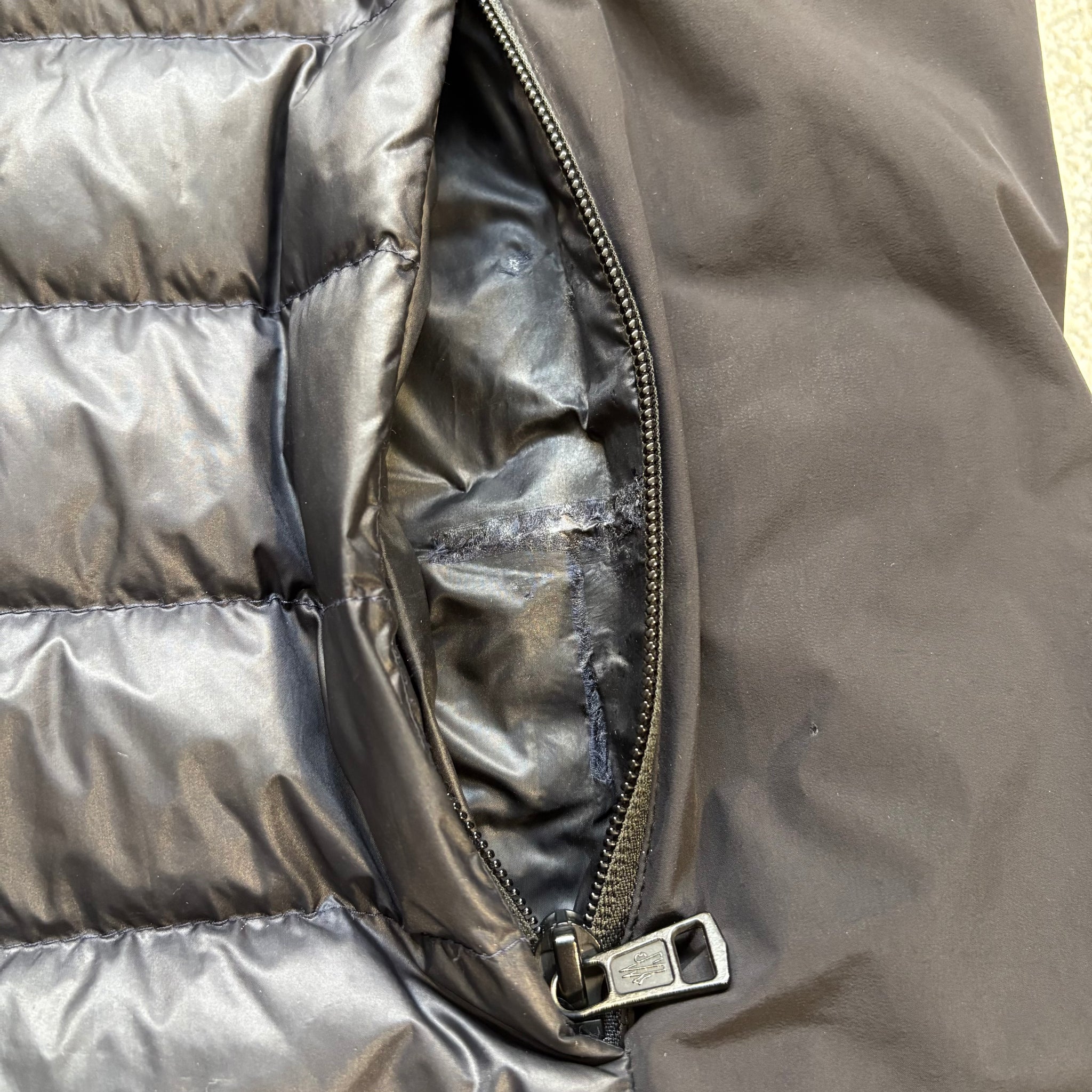 Good condition, small repair on the back as shown. Has some light marks & general wear. Inside each pocket has been repaired where the zips caught the material, not noticeable when worn as internal.