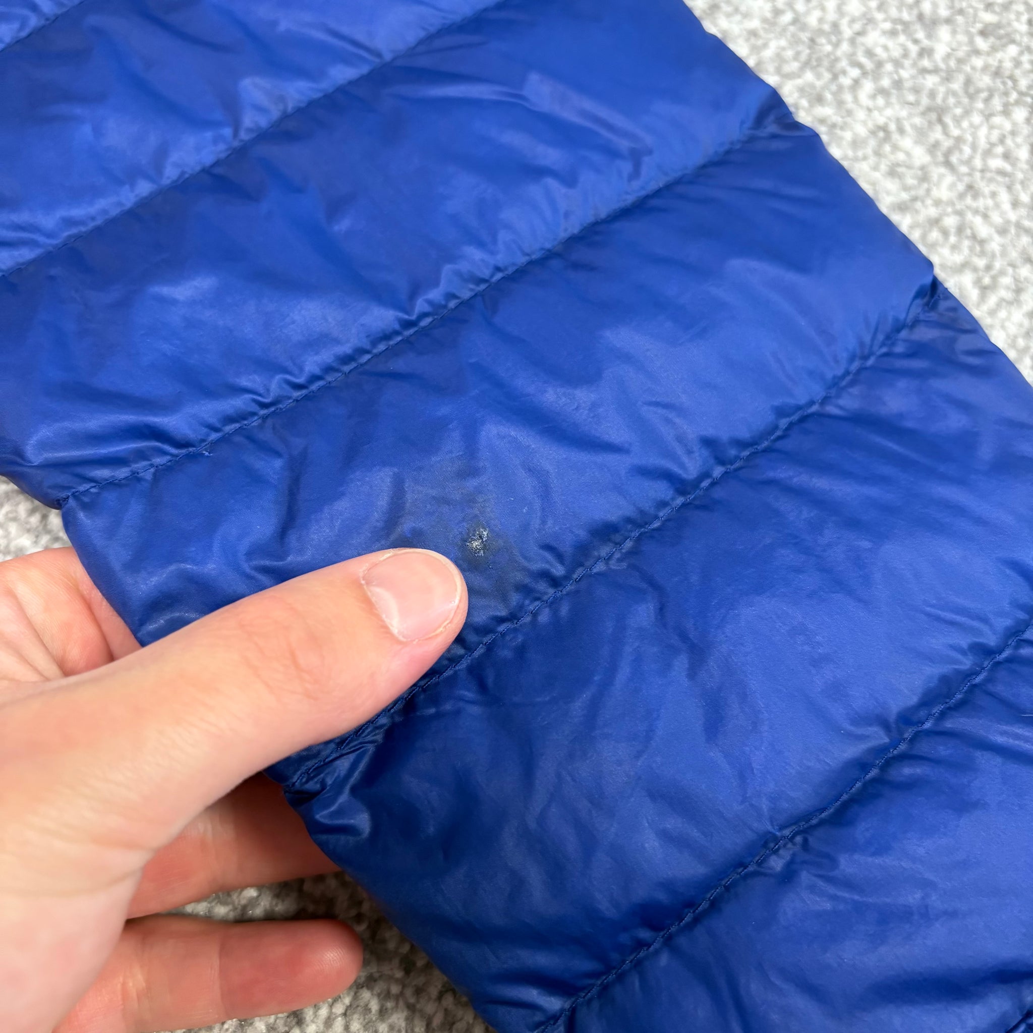Good condition, small repair on the arm & two small nicks. Lightweight down-filled zip up overshirt.